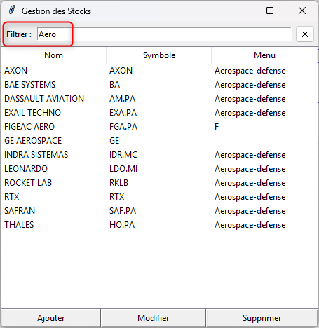 Avec "Aero" je filtre tous les Stocks du domaine de Aerospace-defense.
