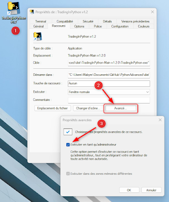 Lorsque vous avez positionné un raccourci sur votre bureau pour accéder à TradingInPython vous cliquer droit sur le raccourci -> Propriétés -> Raccourci