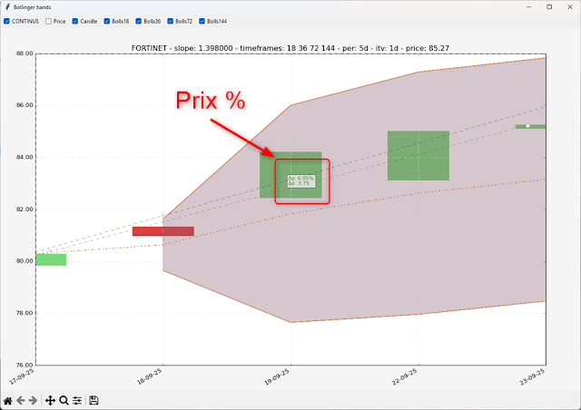 - (3) Prix % : l'écart calculé avec la dernière valeur du cours et la première valeur de la séquence de données ici : période 5d donc le Prix % est l'écart entre la dernière valeur du cours et le cours il y a 5 jours.