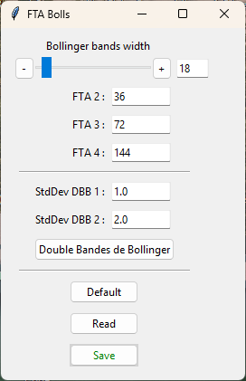 L'interface de Configuration vous permet de modifier les horizons des Four Times Mobile Average (FTA) les moyennes mobiles des Bandes de Bollinger.